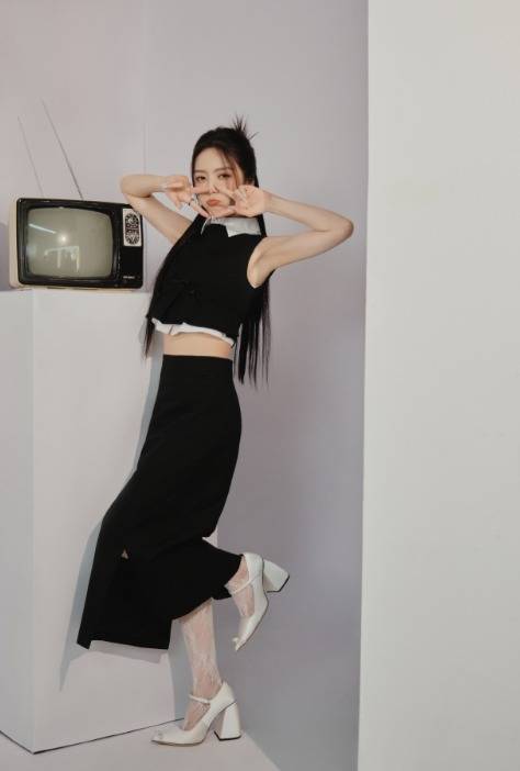 蔡文静黑裙搭白色绣花渔网袜,甜美治愈超可!